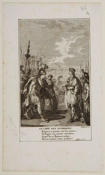 Curator: This engraving by Jean Baptiste Simonet, titled "The Ferraresi and Tuscans Run Off and Disperse, Unlike the Perugians Who Do Not ... (Seventh Canto)," captures a chaotic battle scene. Editor: My first thought? It's a tangled mess! Horses, spears, bodies all crammed together in this tiny frame. A sense of pure pandemonium. Curator: Indeed. Simonet was illustrating a specific historical narrative, likely related to regional conflicts in Italy. Note the distinct attire and weaponry, markers of different factions and their place in the socio-political hierarchy. Editor: But even without knowing the history, you feel the terror, the desperation. That fallen figure in the foreground... it's a stark reminder of the human cost of these power struggles. The detail feels a bit obsessive; it’s like trauma rendered in miniature. Curator: Absolutely. And engravings like these played a crucial role in disseminating information and shaping public perception of these events. This wasn't just art; it was propaganda, influencing opinions and solidifying regional identities. Editor: It’s strange to think about something so small having such a big impact. Makes you wonder what tiny images today will shape our understanding of the past. Curator: Precisely. It serves as a potent reminder of the power of visual narratives in shaping our understanding of history and its ongoing echoes. Editor: A little picture, a lot to unpack. It’s unsettling and compelling all at once.