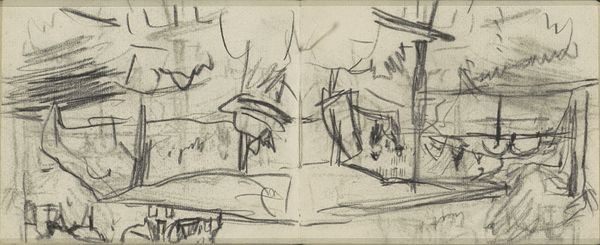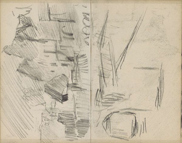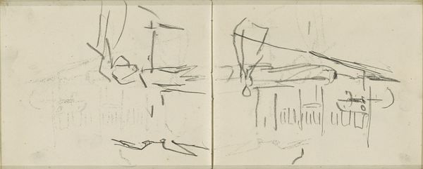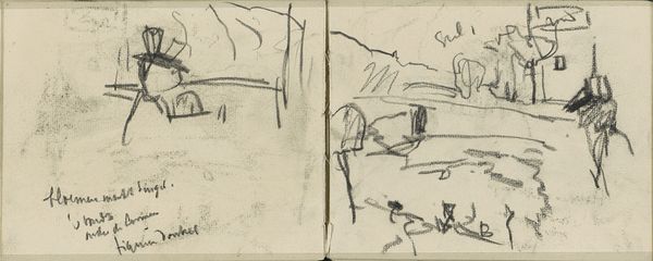 Editor: This is "Hoefsmid, mogelijk aan het Haarlemmerplein te Amsterdam" by George Hendrik Breitner, created sometime between 1912 and 1919. It looks like it was made with pencil and ink, and is currently held in the Rijksmuseum. It feels incredibly raw, almost like catching a fleeting thought on paper. What stands out to you when you look at this sketch? Curator: Ah, Breitner. I feel him, you know? Always rushing to capture the city's pulse. Look at those furious lines - the way he suggests the weight of the horse, the fleeting interaction between animal and blacksmith. It's as if he's trying to bottle Amsterdam's frenetic energy right there on the page! Editor: So it’s not so much about detail as it is about… movement? Curator: Precisely! Forget photographic accuracy, he’s after something more, something *felt*. Notice the negative space, those barely-there suggestions of form. Do you see how they contribute to a sense of immediacy, as if he might abandon the sketch any second? Editor: That makes sense. It does feel unfinished, in a good way. Like we’re catching him in the act of observing. Curator: Exactly! And this, for me, is the joy of Breitner's sketches. They aren't polished pronouncements; they're whispers from his creative process. It reminds me that art can be an experiment. It's the idea that matters and comes through, like the noise from a busy marketplace. Editor: I’d never thought of it that way before - like eavesdropping on the artist's thoughts! Curator: It's like a snapshot of a moment in time, but also of the artist's mind, so to speak. It’s rough, it’s quick, it’s honest, but more than anything it's revealing. Editor: Well, now I see this not as just a simple sketch, but as a raw and energetic portal to old Amsterdam through Breitner's eyes! Curator: See? That’s what a little curiosity and careful consideration will uncover!