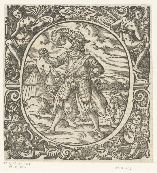 Editor: Here we have Jost Amman’s "Koerier" from 1573, a woodcut print. It features a rather stately-looking courier against a backdrop of tents and activity. The details seem so intricate, like miniature labors captured in ink. What’s your read on this piece? Curator: Well, given the context of the late Renaissance and Amman's focus as a printmaker, it's interesting to consider how this image was produced, circulated, and consumed. Woodcuts allowed for mass production, making imagery like this accessible beyond the elite. Consider the labor involved – the cutting of the woodblock, the inking, the printing itself – each step a skilled craft. Editor: That's a fascinating point. So it’s less about high art and more about the accessibility afforded by the materials and the process? Curator: Precisely. And think about what a “courier” signified in 1573. This wasn’t just someone delivering messages; it was a vital component of political, military, and economic systems. Amman's choice of subject says something about his interest in those systems. He is representing how knowledge and goods are transported. Are you thinking about how his clothes relate to a rank? Editor: I hadn't, but it makes sense. The quality of the printing almost mirrors the importance of his task... almost as though the image amplifies the prestige and materiality of what a courier delivers? Curator: Indeed! The image itself becomes a commodity, conveying not only the likeness of a courier, but also a message about the socio-economic networks it represents. The very means of its production contributed to those networks. Editor: It's incredible how a simple woodcut can reveal so much about production and societal function. I was so focused on the figure, but this material lens makes me think of everything *around* the courier too. Curator: Exactly. Art isn't just about the image itself, it's about the hands that made it, the system that supported it, and the audience who consumed it.
