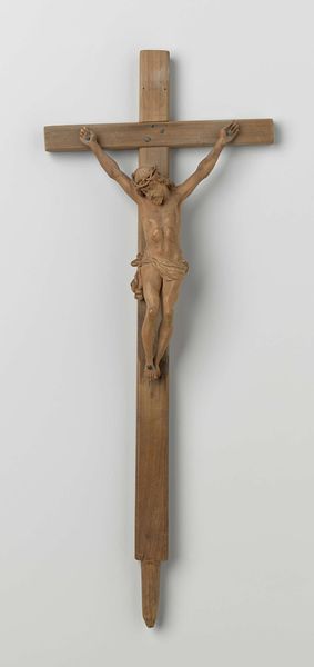 Editor: This is Artus Quellinus’s “Atlas, Model for a Statue on the West Facade of the Amsterdam Town Hall,” sculpted between 1650 and 1651. It’s currently housed at the Rijksmuseum. The rough, unfinished surface and dynamic pose create such a sense of tension and implied power. What elements of its composition stand out to you? Curator: Immediately, the Baroque dynamism strikes me— the pronounced muscularity, the tension in the limbs, the suggestion of immense weight he strains to bear. Consider the manipulation of light and shadow; the deep carving creates dramatic chiaroscuro across the torso and legs, enhancing the emotional intensity. Do you perceive a structural principle that organizes the work? Editor: I see a triangular shape with Atlas at the apex and his legs creating the base, but I wonder why his face and hands are unfinished. What does it say about Quellinus' intention? Curator: Indeed, the lack of detailed facial features directs our focus to the body, to pure form and physical effort, in terms of visual language. Could the unfinished state contribute to an interpretation centered on potentiality, rather than a completed or resolved state of being? This "being" echoes the struggle. What effect does that produce? Editor: I see what you mean, with no clear expression in the face the viewers focus is redirected to appreciate the craftsmanship behind his physique. Thank you for walking me through the artistic construction of this piece! Curator: A privilege to contemplate artistic structure with you, the key to the sublime in Baroque sculpture.