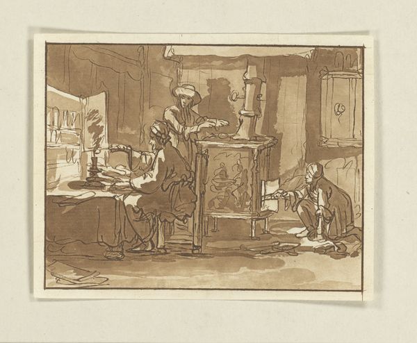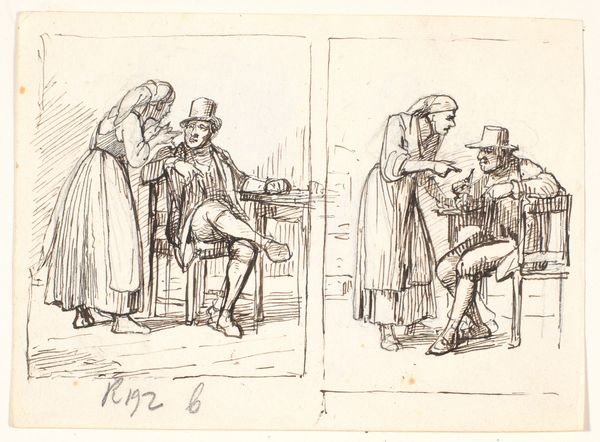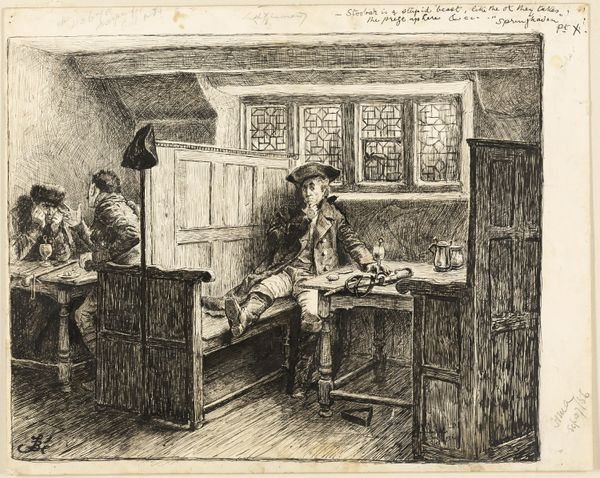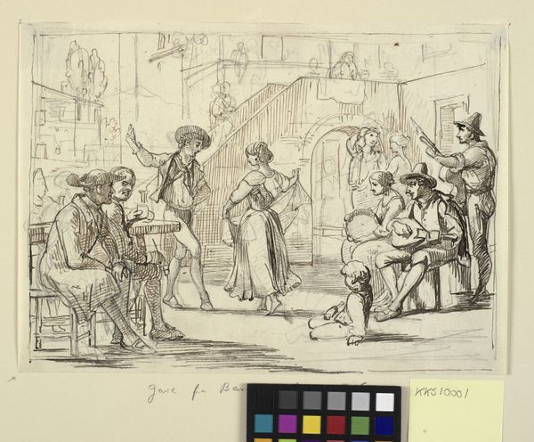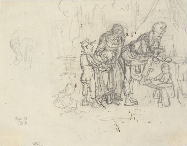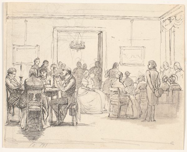 Curator: Welcome, let's talk about George Cattermole’s "View of Library," currently held at the Art Institute of Chicago. Though undated, it presents a fascinating peek into, well, a library scene! Editor: My first thought? An attic, or some other crammed, secret space, given the rushed nature of the strokes—but not cramped in a bad way! A little messy but kind of buzzing with thought. Curator: It does feel incredibly immediate, doesn't it? Cattermole primarily worked in graphite, ink, and pencil on paper for this piece. Note the tentative lines of the sketch giving way to a richer application of ink in select areas. I get the sense of figures immersed, cocooned even, in this interior. Editor: Tentative is right! It speaks volumes, though, about access. Consider the materiality; graphite and ink—humble materials that make artwork feel both ephemeral and, ironically, somehow ‘realer’. What did it mean for Cattermole to portray scholarly spaces using everyday instruments of writing and sketching? It implies study shouldn't be something so unreachable. Curator: Yes! A place for the everyday. These might be men, perhaps clerics, absorbed in intellectual pursuits or perhaps even students at study? There's such quiet industry about the image that's also hinted at by the somewhat academic grouping of people around a table in the other room. I like the kind of intimacy the composition provides—almost as though we’ve been invited inside, unannounced! Editor: Exactly! And those repeating stacks, the architectural logic—or lack thereof. Those book stacks weren’t born spontaneously! Craftspeople spent their time selecting, sawing, joining… I’d love to know where Cattermole’s raw materials came from: The mines for graphite? Which factory was churning out his inks? To me it feels incomplete if we do not ponder labor in every element here—intellectual and industrial both! Curator: The thought processes behind making it all. And the space the library offers for so many disparate figures, physically close to one another in such small spaces. All captured on this quite diminutive piece of paper with these rudimentary but oh so precise mediums. It really pulls the viewer in. Editor: Incomplete but perfect, if you catch my drift. Curator: Precisely!