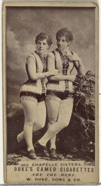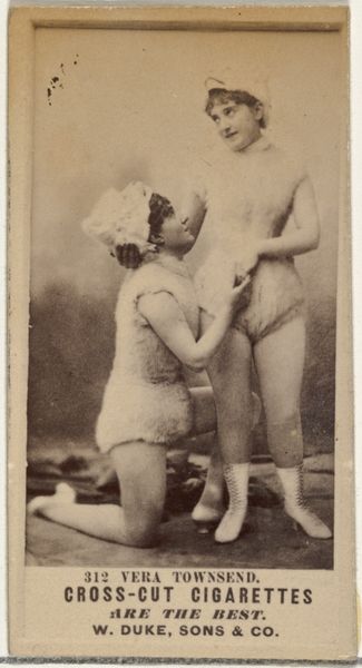 Curator: Look at this quirky image! It’s titled “Card Number 347, Richard and Letrey” from the “Actors and Actresses” series. It was part of a promotional campaign by Duke Sons & Co. for Cross Cut Cigarettes back in the 1880s. Editor: What strikes me first is how strangely arresting this little tableau is. These two figures…are they about to go swimming, play a brass fanfare, or… well, something else entirely? It has that beguiling, slightly surreal feel of a dream. Curator: Exactly! It’s a trade card, intended to be collected and traded, showcasing popular performers. But the outfits… quite suggestive for the period, and very playful, almost daring for a tobacco advertisement. Editor: Absolutely! Consider how such images circulated – creating aspirational figures for the public to emulate, contributing to the popular culture, shaping consumer desires through the enticing link between glamour and smoking. Did smoking Cross-Cut make one suddenly stylish… or musical? Curator: Probably not! Although this connects to the larger cultural phenomenon of celebrity endorsements even back then. Richard and Letrey were undoubtedly recognizable figures, which adds a layer of social context now lost, doesn't it? Though, it makes you wonder who chose the acts they endorsed…! Editor: Definitely. It's also a snapshot of changing gender roles; women publicly engaging, performing, shaping a growing entertainment sector. And beyond just the personalities featured on them, this card really asks us to consider how visual media becomes intertwined with the formation of individual identities. How we perform ourselves as citizens and consumers. Curator: I agree, its historical resonance goes beyond just a simple advertisement. Editor: Indeed, Richard and Letrey and Cross-Cut become fascinating vehicles of analysis, providing much for both historians, as well as creative daydreamers, to ponder.