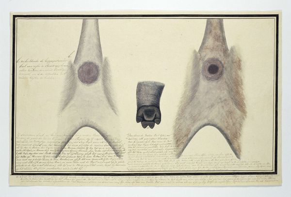 This drawing of a Hippopotamus, rendered by Robert Jacob Gordon, reveals more than just the animal's anatomy. Notice the detailed rendering of the hippo's reproductive organs, presented almost as a scientific specimen. Consider how animals, particularly their reproductive organs, have been laden with symbolic weight across cultures. In ancient Egypt, the hippopotamus was associated with fertility and motherhood, embodied by the goddess Taweret. In other contexts, animals might represent primal instincts and unchecked desires. The scientific and detached approach of this drawing underscores the shifting perceptions of the natural world during the Enlightenment. Yet, the persistence of the animal form itself evokes more ancient, subconscious connections to the animal kingdom, touching upon the primal aspects of existence. These connections and their associated meanings are not linear but cyclical, resurfacing and evolving across time.