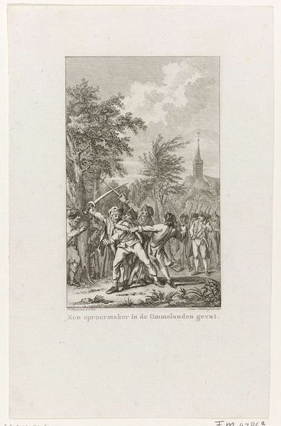 Curator: Wow, that's intense! My first reaction is…grim. Like a historical freeze-frame of treachery. So much pent-up drama frozen in ink. What do you see? Editor: This engraving, made by Pieter Tanjé between 1747 and 1759, depicts the murder of Floris V, Count of Holland, in 1296. As a historical print, this work functions as a narrative tableau. Curator: Narrative, yes, exactly! You get this distinct feeling of "something happened here." And judging by the title printed at the bottom, “Moord op Floris V, 1296", it wasn't pretty. What a tale of betrayal etched in monochromatic tones. Editor: Absolutely. The event itself became a potent symbol in Dutch history. We can interpret it as speaking to anxieties around power, authority, and justice. This imagery presents clear ideological implications regarding the political landscape. Curator: See, that’s what’s cool—how an image like this can pack so much political weight. Looking at the victim impaled, the landscape bearing witness—it speaks to how violence imprints itself onto our memory, into our land. Plus, look at those rigid figures on horseback – they could easily embody repression of freedom. Editor: Indeed. And note how the artist positions Floris slightly lower than his murderers, accentuating a visual power dynamic reflecting the political subjugation being displayed. I also read the setting in terms of the tensions of civilization versus the "natural" world – a popular binary trope we must acknowledge when deconstructing images such as these. Curator: Oh, definitely. The trees seem almost menacing, sheltering the act, whispering secrets to each other. The Rijksmuseum truly has a treasure trove here, offering viewers much more than simply a window into the past. This piece asks questions, it screams. Editor: Precisely, and its ongoing dialogue speaks to power structures. Consider also the medium—print—allowing wide dissemination of this brutal event. A crucial piece for anyone studying sociopolitical currents running throughout art history. Curator: Right! So, next time you feel like jumping into the Wayback Machine of history—with all its messy human conflicts—just remember pieces like these. So stark. So telling. Editor: Absolutely. As both a reflection and a construction of its time, it encourages critical examination and intersectional awareness.