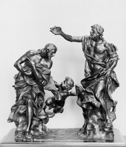 Curator: At first glance, I see movement, figures caught in an elegant dance. It's dynamic but contained, powerful yet delicate. Editor: Precisely. What we are viewing is a sculpture dating from 1735 to 1745. It’s attributed to Balthasar Ferdinand Moll, and is aptly titled "Faith, Hope, and Charity." The piece is crafted from wood, which adds an unexpected warmth to the Baroque style. You can currently see it displayed at the Metropolitan Museum of Art in New York. Curator: Wood gives it an accessibility, doesn’t it? Makes it less intimidating than marble, perhaps more... human. It brings to mind, quite obviously, the allegorical. Editor: Indeed. During this time, artists often used allegories to subtly communicate philosophical or religious ideas, sidestepping overt pronouncements, often in repressive contexts. Curator: Yes, this brings forth that tension. Each figure embodies a virtue—we understand their significance, these core virtues necessary for salvation in Catholic theology. But the interesting element is in understanding the psychological importance for laypersons, in creating these emotional states within their lives and practices. Editor: The positioning, in my mind, speaks to this quite literally. The swirling drapery adds dynamism. Think of what was happening socially: The Enlightenment was gaining momentum and here we have the sculpted representations, offering stability during the quickening transformation from sacred to secular social rule. Curator: A counterbalance. These weren't just pretty decorations. It’s about reminding the viewer of core, perhaps traditional values amidst massive cultural upheaval. Are we secure because of hope? Because of faith? Because of love? Or will these change? Editor: It’s a dance around power, isn’t it? Between personal morality and overarching societal structures. We see this wooden troika of allegorical figures holding significant weight and in these questions we see the power dynamics between secular and nonsecular existence. Curator: It’s an eternal debate, rendered beautifully in a single piece. I still feel as if the psychological weight lies in our interpretations. What do these women say, feel, to our internal values. Editor: Well said. It will remain ever-evolving in context and that truly gives the artist continued value.