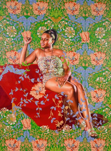 Curator: We’re looking at Kehinde Wiley's "Naomi and Her Daughters," created in 2013 using acrylic paint. The piece stands out through the artist's fusion of contemporary portraiture with ornate patterns. Editor: Wow, it’s…a lot, isn't it? The figures feel very grounded but that kaleidoscopic backdrop really throws me for a loop! It's like they are caught in a whirlwind of William Morris wallpaper. Curator: Indeed! Wiley often positions his figures—typically young Black men and women—within historically loaded contexts. In this work, one cannot help but reflect on the juxtaposition of contemporary Black women portrayed against a backdrop reminiscent of European decorative arts, and question ideas around visibility, representation, and power. Editor: It almost feels rebellious, like they are reclaiming these spaces, tearing away old assumptions of beauty and placing themselves front and center, loud and proud! The flowers weaving around them... it’s like they are sprouting from within. Is it empowerment, a challenge, or something else? Curator: All these readings are plausible! Wiley's art consistently grapples with those tensions between appropriation and empowerment. Here, the references to historical portraiture traditions challenge art historical canons by inserting Black bodies into them, thus engaging in conversations about race, class, and gender in art. Editor: The more I look, the more I love the contrasts. Those simple stripes on one sister and the solid red of another pop up against the busy wallpaper in unexpected ways. Is it chaos or intentional disharmony? Or maybe both, just reflecting the chaotic, beautiful, hot mess of our lives? Curator: Well said. Wiley certainly doesn't shy away from complexity, compelling us to examine the nuanced ways in which identity is constructed and performed. It is through these layers that the work provokes profound reflection. Editor: What strikes me is that even amongst all those vibrant colors and clashing styles, there is something really beautiful and deeply intimate happening between those sisters. And ultimately, isn’t that what really matters? The rest? Maybe just beautiful noise.