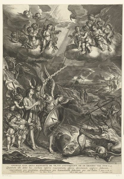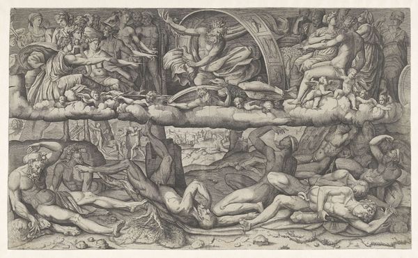 Curator: The Rijksmuseum holds this fascinating print entitled "Breaking of the Sixth Seal," dating from 1563 to 1574. It's attributed to Gerard van Groeningen and rendered with engraving techniques. Tell me, what’s your immediate take? Editor: Chaos! But artful chaos, if that makes sense. My eye bounces all over, a swirl of figures and… are those clouds? It's intense, unsettling, like a glimpse into some bizarre dream. Curator: Indeed! The scene depicts a passage from the Book of Revelation. Notice the celestial realm above—the sun and moon are darkened, stars are falling. Groeningen masterfully portrays the cataclysmic events unfolding as the sixth seal is broken. The text at the bottom translates to: “Behold those slain at the altar, killed for Christ." Editor: Ah, I see it now, the fallen figures below. So it’s a vision of apocalypse? It's very melodramatic, operatic even, which makes it almost... alluring? And that rider on horseback – is that Death? He certainly seems to be having a field day. The whole thing feels performative to some extent. Curator: Absolutely. The Mannerist style is prominent here; exaggerated poses and emotional expressions amplify the drama. It emphasizes the weight of religious martyrdom and the terror of divine retribution. But there's more – notice how Groeningen uses specific symbols and spatial arrangements to build that weight. Each figure is very deliberately placed and the artist’s intention seems very clear. Editor: Right, the cascading bodies definitely underscore a feeling of inevitability, doom closing in from all sides. And that dense, cross-hatched engraving – talk about textural intensity! The medium itself seems to add to the sense of frenzy. All in service to this single, concentrated message. Curator: Exactly. The engraving medium enhances both the level of detail and emotional intensity. And there’s that tension between what seems purely fantastical versus what represents some deeply rooted collective anxieties of the time. Editor: So it's more than just pretty doom and gloom! Though the art of communicating existential angst definitely has its appeals. I appreciate now, having looked closer, that so much technique, intention, history, and theology come into play, converging onto a relatively small, delicate piece. Curator: Precisely! Groeningen created an experience to prompt deeper reflection, echoing across centuries. Editor: Quite right. Leaving me with the feeling of wanting to check the news for end-of-days headlines. And to maybe start that apocalypse bunker, just in case.