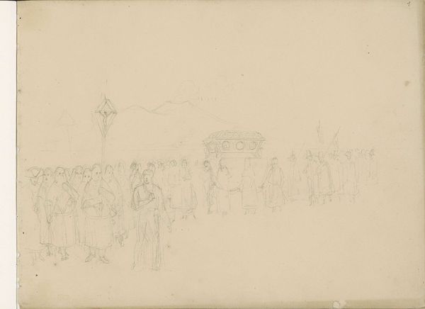 Winslow Homer rendered "Officers and Horses at Rest" with graphite on paper. Notice how Homer uses delicate lines to define the forms of soldiers and their horses. The composition is divided into two distinct registers, each presenting a different arrangement of figures. Homer uses line and form to capture a sense of quietude amidst the potential chaos of military life. The sketch-like quality destabilizes the traditional heroic depictions of war, offering a more intimate, human perspective. The absence of dramatic action shifts our focus to the subtle interactions between the officers and their mounts. The linear quality of the work invites us to consider the structured relationships between the figures and their environment. This piece functions not only as a visual record but also as a commentary on the psychological space of men at war, subtly conveyed through the structural elements of line and composition.