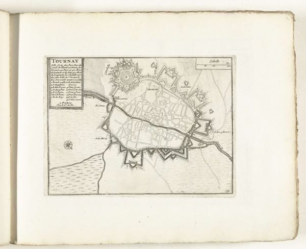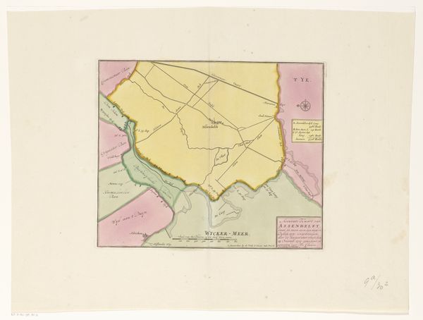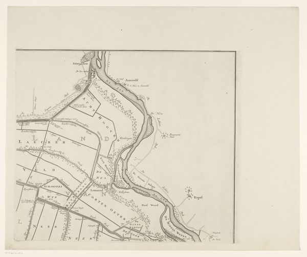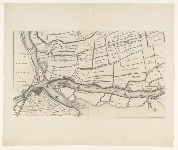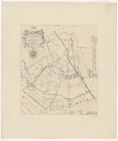 Editor: We’re looking at an engraved map from 1718, titled "Kaart van Assendelft met dijkdoorbraken, 1717," which translates to “Map of Assendelft with breached dikes.” It’s a detailed rendering in ink, and my initial thought is how clearly it demarcates space, almost like a stark diagram. What do you see when you look at this piece? Curator: Its composition reveals a carefully constructed hierarchy. Observe how the lines vary in weight, some boldly defining geographical boundaries, others delicately tracing waterways. This visual structure isn't merely representational; it's a deliberate arrangement intended to convey information and potentially, a specific viewpoint on the landscape and its vulnerability. Note the sharp delineation, which offers a precise and objective feel, seemingly free from embellishment. What structural elements contribute to this effect of detached precision? Editor: I guess the stark contrast between the lines and empty spaces. The shapes almost seem like abstract forms independent from their function as a map. Is it fair to say that this is almost an early form of information art? Curator: I would argue it shares visual language with abstract expressionism in the sense that each area or form contributes to an overall composition. Its intention is rooted in function rather than purely aesthetic exploration, though. Consider how the very materiality of the engraving—the incised lines on the plate, the pressure applied during printing—impacts the overall reading of the work. Can we divorce its informative function from the purely visual experience? Editor: That's a very helpful consideration. Thank you for this observation about materiality; it is something to bear in mind going forward. Curator: You're most welcome. Exploring such intersections allows for deeper insights into the multifaceted nature of art, its structural components, and how meaning is conveyed through form.