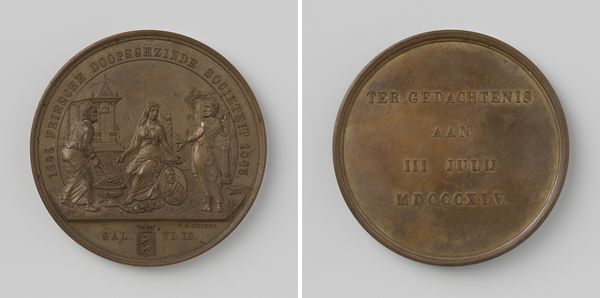 This bronze medal commemorating Leopold of Saxe-Coburg’s oath to the constitution was created by Joseph-Pierre Braemt in the early 1830s. The medal’s modest size and material speak to its function as a memento, produced and circulated widely to mark a key political moment. Its materiality also reflects a shift in the way power was represented at the time. While cast bronze had long been used for monumental sculpture, here it is pressed into service for a commemorative object. The relatively low cost and ease of production of striking medals allowed for broader distribution than traditional art forms. Consider the labor involved; the medal was likely made using industrial processes, hinting at evolving notions of production. The detailed relief of the lion and inscription demonstrate the skill and precision required for die-making. By examining the medal's material and production, we can better understand its cultural significance and how it reflects the changing dynamics of politics and society in the 19th century.