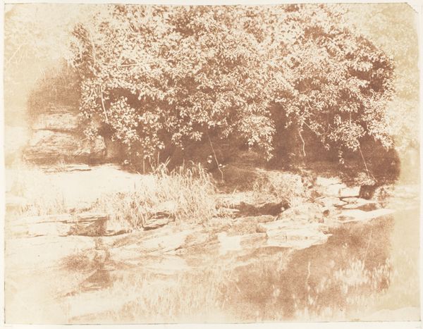 Curator: Looking at "Belle-Croix," a landscape photograph created by Eugène Cuvelier around the 1860s. It’s a contact print, utilizing paper as its base, a technique prevalent during that period. Editor: The overwhelming feeling is one of quietude. The composition, a seemingly simple reflection of trees in water, becomes almost dreamlike in its subtle tonal gradations. The materiality contributes greatly to its subdued and still character. Curator: Precisely. Cuvelier's mastery is evident in his ability to render such detail within a restricted tonal range. It demonstrates how photography became art with the plein-air artists capturing nature like this one during this epoch. Think of this process being heavily associated with Naturalism and Romanticism at the time. Editor: But there is something unsettling about this Romantic vision. These roots plunging into the water, the upside-down doubling. Nature's inherent mirroring creates disorienting tensions. Does the location itself carry specific cultural connotations perhaps, influencing the meaning encoded in its production and consumption? Curator: That's perceptive. While the title suggests the presence of a "beautiful cross," potentially hinting at Christian symbolism integrated into the French countryside, its effect is quite sublimated within a general visual assessment of an environment, no architectural cross is directly observable to indicate Cuvelier’s personal conviction about this site. Editor: These natural landscapes rose into popularity with artists when new transportation opportunities were provided to middle class, increasing possibilities for mass tourism which definitely impacted production for public viewership. Curator: Indeed, as industrialization intensified, this type of imagery provided a form of visual respite, shaping collective values. Editor: In all, it highlights the ability of nature both to enchant and slightly unnerve when rendered with such meticulous attention. Curator: It certainly showcases Cuvelier's exceptional ability to capture and evoke such refined sensory qualities.