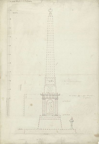 Curator: Here we have an intriguing drawing, titled "Fountain with Obelisk," believed to be from the 18th or 19th century. It's currently housed here at the Metropolitan Museum of Art. The work seems to incorporate pencil, etching, and other print techniques. Editor: My initial thought? Serene. Almost utopian. The delicate lines create this peaceful architectural fantasy. The obelisk pointing towards some hopeful destination. Curator: Indeed. Obelisks themselves carry such potent symbolism—reaching for the heavens, a connection between the earthly and the divine. Think of their presence in ancient Egyptian culture. What do you make of its Neoclassical leaning? Editor: Oh, absolutely. The clean lines, the emphasis on order and symmetry… it speaks volumes about that era's fascination with classical antiquity. We see these clean, geometric designs reflecting the desire to capture perfect beauty, almost like an echo of a lost, perfect age. You see how everything is centered; a perfect, geometric shape within a rectangle that makes me think of the camera’s view finder. Curator: I am quite interested in its placement atop this ornate fountain, ringed by sculptural figures. Perhaps these classical elements soften that linear aspect you mentioned earlier, infusing life and drama around the cold obelisk. I see what you meant by ‘fantasy’, its more fantastical that way! Editor: Those fountain figures could certainly symbolize abundance and prosperity. There is also some possible tension—water is life-giving, ever flowing and so fluid, while the obelisk represents permanence, static energy, stillness. The composition suggests this interplay, an almost alchemic opposition. But tell me, what do you get from that ambiguity? Curator: What captivates me most is the interplay between the medium and the subject matter. An obelisk etched in such soft materials! How light that makes this seemingly heavy structure! A celebration of classical ideals through the gentlest, fleeting artistic means. How delicate it looks makes the entire thing feel fleeting, like it could be blown away in any strong wind! Editor: Fleeting beauty rendered with precision, it makes me dream of things built to inspire, instead of dominate. An invitation into introspection, rather than dominance.