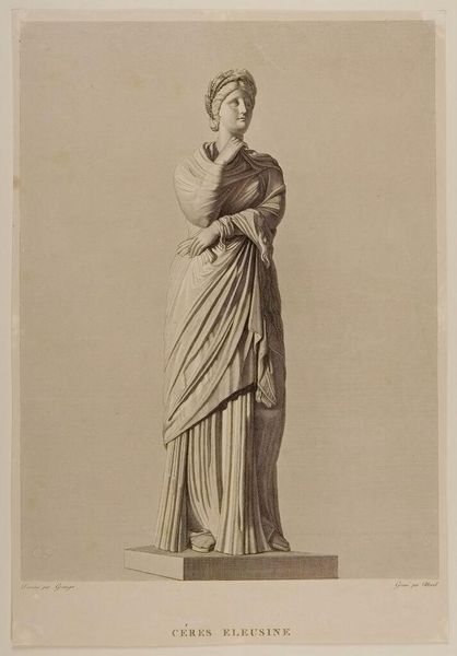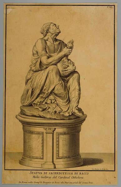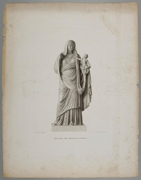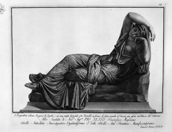 This is an engraving of a sculpture titled 'Veiled Matron,' by Giovanni Battista Piranesi. The figure is centrally positioned, its verticality emphasized by the dense, cascading folds of the drapery. The texture ranges from smooth to deeply etched, creating a dynamic interplay of light and shadow. The woman's gesture, hand to her face, adds a layer of emotional complexity. Piranesi’s work is steeped in the artistic and philosophical discourse of his time. The subject's pose and garments are signs of ancient Roman virtue, drawing on classical codes of representation. The sharp lines, spatial depth, and dramatic contrasts are characteristic of Piranesi's style. The attention to detail and dramatic presentation are not merely aesthetic; they engage with larger issues of cultural memory, the sublime, and the power of representation. Consider how the starkness of the engraving underscores a sense of monumentality. The figure’s veiled face—a potent signifier— invites us to question the boundaries between revelation and concealment, presence and absence. It highlights that art exists within a perpetual cycle of interpretation, challenging our own assumptions about antiquity, identity, and meaning.