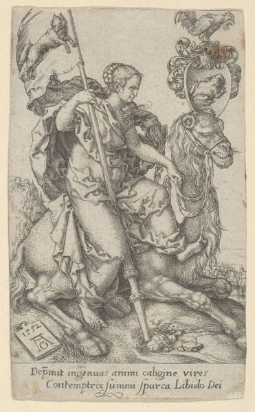 Heinrich Aldegrever crafted this intricate engraving, "Hercules Capturing the Arcadian Hind," around 1550. The composition surges with a dynamic interplay of textures, where muscular forms and organic contours meet the rigid lines of the surrounding landscape. Aldegrever masterfully uses contrasting lines to bring the scene to life. Notice how Hercules' robust figure and the Hind's textured coat are rendered through tight, controlled hatching, emphasizing their physicality and struggle. The lines create a complex semiotic system where Hercules' conquest symbolizes human dominance over nature, a recurring theme in Renaissance art. Consider how the scene is framed by contrasting elements: the dense thicket on the left and the stark, inscribed tablet on the right. This juxtaposition could be viewed as an early exploration of structuralist thought, where meaning arises from binary oppositions, challenging fixed interpretations and inviting continuous engagement.