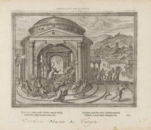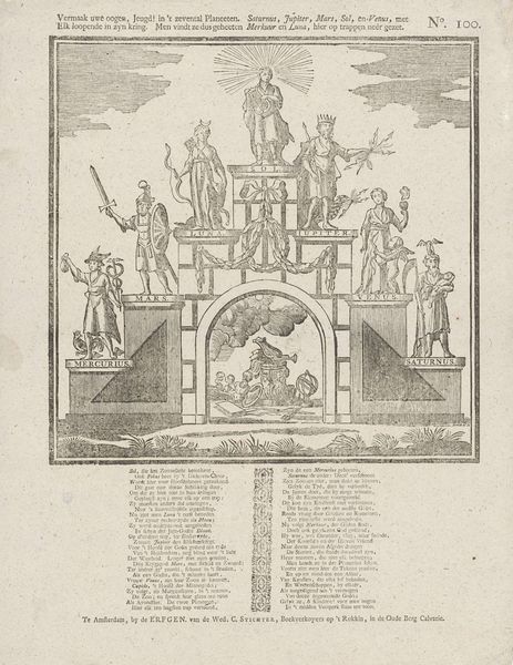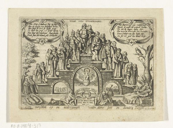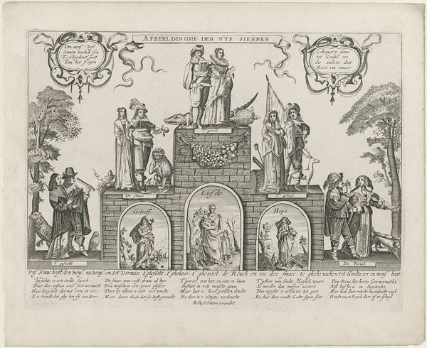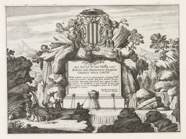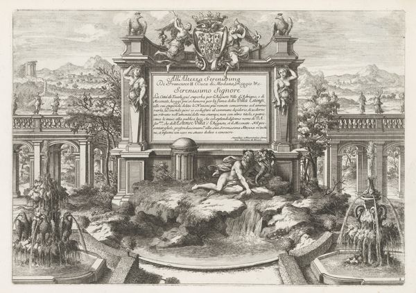 Editor: This print by Melchior Küsel features an elaborate architectural fountain, its date is unknown. It’s quite striking, with all the cherubs and intricate details. What do you see in this piece? Curator: I see a deliberate construction of power. Fountains weren't just decorative; they were displays of wealth and control over resources. How does the inscription, praising a patron, fit into this visual language of dominance? Editor: So, the fountain isn't just pretty; it's political? Curator: Exactly! And the cherubs, even the architecture, become tools in legitimizing power. It’s a carefully crafted message about authority and the social hierarchy of the time. Editor: That definitely gives me a new perspective. I hadn't considered how much these images communicated about social structures. Curator: These images give us an insight into a time when art was always communicating status. It is important to consider the message art conveys.