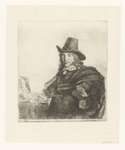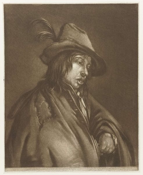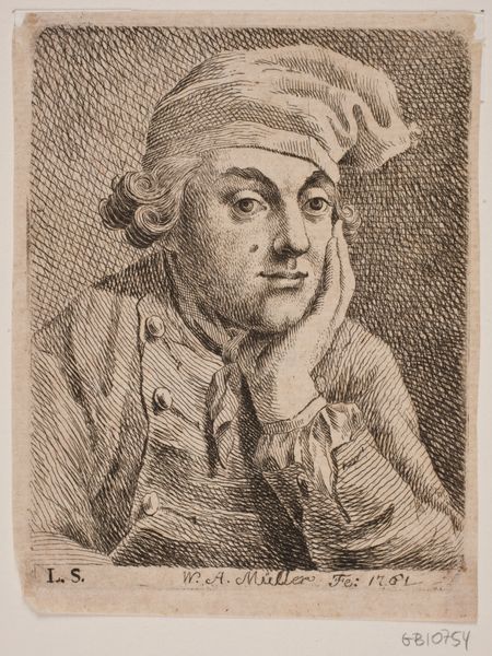 Editor: Here we have Giovanni Marco Pitteri's "A Man with a Beret and a Fur Collar," an engraving from the 1750s. It's struck me how…severe he appears. Almost challenging. What do you see in this portrait? Curator: Well, looking at the attire, it's indicative of wealth, clearly designed to project authority and status within a very rigid social hierarchy. The fur collar, the beret – they aren't simply about warmth. Think about the historical moment: this portrait was produced in Italy. Do you consider how the identity of marginalized people such as jews, people of color and the working class where affected by those in positions of power in this artwork? Editor: I hadn't considered it in that light. I was so focused on the individual. I mean, shouldn't portraiture reflect something unique about the subject? Curator: And what constitutes 'unique' when the entire visual language of the portrait is constructed to uphold existing power structures? Even the shadows and lighting contribute; notice how the face is partially obscured, creating a sense of mystery, of inaccessibility, which would not be offered to any average man. I urge you to consider which average man and woman were and weren't given an audience. Do we really "know" this person? Or is it a calculated performance? Editor: I guess I was seeing it as a representation of a person, not the representation *of* power, or rather the performance of power. It really changes how I see the artwork, thinking about it as more than just one man, but part of a larger structure. Thanks. Curator: Exactly. It is about acknowledging art as a dialogue with society. Always consider that art and its surrounding political forces affect people, either the figure or the potential spectator. Editor: That makes a lot of sense. I'll keep that in mind moving forward.