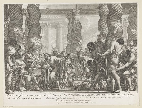 Curator: Here we have Michel Dorigny’s “Adoration by the Kings,” an engraving from 1638, showcasing a classic baroque sensibility. Editor: It has an undeniable gravity, a solemn processional unfolding before us. The figures lean heavily forward, an overwhelming weight of purpose. Curator: The artwork, of course, depicts the biblical scene where the three kings or Magi pay homage to the infant Jesus. But let’s consider the historical backdrop— the print was created during a period of intense religious and political upheaval in Europe. These prints served not merely as devotional items, but as potent reminders of religious authority and continuity. Editor: Observe the recurring motifs; the horses, symbols of power and royalty, are strategically positioned to underscore the authority of the Kings and, by extension, the divine significance of the event. The torches create these incredible visual cues suggesting sacred illumination. Curator: Precisely! Dorigny strategically uses established visual cues in the Baroque era that signaled authority and divine blessing, a visual rhetoric embraced by the Church. Look at the architectural details, the heavy stone and classical motifs that project stability and endurance. Editor: But is this merely a representation of faith? Consider how the act of adoration is emphasized; bodies literally prostrate themselves, overwhelmed in deference. There’s more than meets the eye: we're asked to confront human insignificance before divine authority. Curator: In examining Dorigny’s context, printmaking allowed this imagery to reach wider audiences. It was critical to reaffirm Catholic orthodoxy, particularly in regions experiencing Protestant reformation. Art became a very potent tool within the religious and political arena of the 17th century. Editor: Dorigny crafted much more than a devotional image; his composition operates as a cultural mnemonic, solidifying and disseminating certain religious principles and their historical and social weight within the context of European society at that time. Curator: Seeing the Adoration in light of its historical place makes it abundantly clear just how charged and purposeful an artistic representation can be within an ideological movement. Editor: Indeed, tracing the symbolic narrative with how it corresponds to those social realities shows that artwork carries historical consciousness into our own perception.