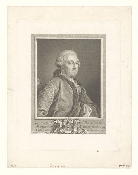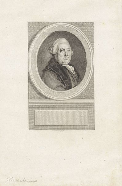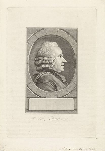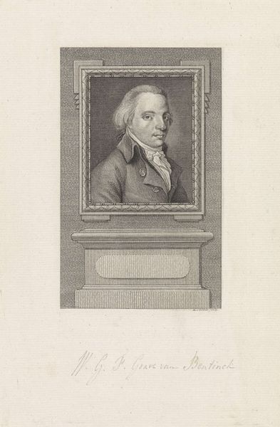 Editor: We're looking at a print titled *Portret van Karel Willem Ferdinand hertog van Brunswijk-Wolfenbüttel*, created between 1786 and 1809 by Reinier Vinkeles. It’s housed in the Rijksmuseum, and its subdued palette makes it seem almost dreamlike. It feels very formal and imposing; what strikes you about this piece? Curator: You know, it's interesting you say "dreamlike". Looking at it, I feel like I'm peering back through a dense fog of history. This engraving offers a really neat portal into the Neoclassical period. It’s a statement on power, carefully constructed. Notice the architectural frame—it mimics the classical structures being rediscovered and idealized at the time. Think of it as stagecraft, carefully crafting an image of leadership. Does the subject himself seem like he’s ‘performing’ to you? Editor: That’s a great point! He does seem quite self-aware, almost posing. I hadn't really considered the theatrical aspect before. So it's not just about documentation, but about crafting an image? Curator: Exactly! Vinkeles isn’t just making a copy. He’s participating in building the Duke's legacy. Consider the very clean lines, the idealised presentation of the figure – no warts and all here! What feeling do *you* get from his gaze? Direct, isn't it? Editor: Now that you mention it, it feels a little…unsettling. Direct, but almost cold. Curator: Precisely. He's meant to inspire awe and maybe just a touch of unease, solidifying his authority. Seeing the power of art and politics intertwined like this always leaves me floored. It really wasn’t about "warts and all"! Editor: I’ll never look at portraits the same way again! There is a silent narrative to be read when interpreting one. Curator: That's it! You’re already speaking fluent art! It really gets you thinking.