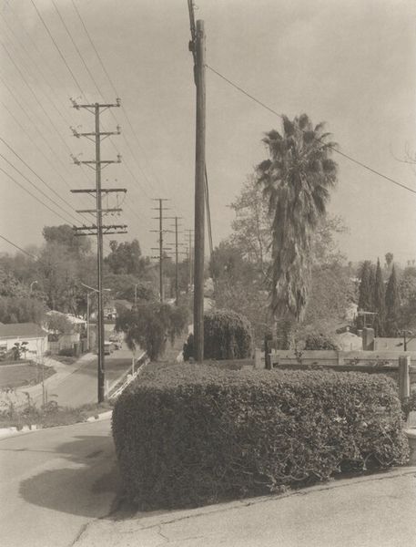 Curator: Madoka Takagi’s gelatin-silver print, possibly from 1995-1996, captures a street corner in Silver Lake, Los Angeles. The title is "Marathon Street/Lafayette, Silver Lake." My immediate reaction is a sense of quiet desolation, the high-key tonality feels bleached, as if light has washed all color and vibrancy from the scene. Editor: Yes, there is a certain quietude, even monotony, evoked by Takagi's image. This work documents a specific time and place in Los Angeles, perhaps inviting commentary on the uniformity of suburban development. The visual elements within the frame – the aged automobile, power lines, palm tree – speak volumes about societal infrastructure and cultural assimilation within an American landscape. Curator: Structurally, I'm intrigued by the interplay of verticals: the power poles, the stark palm tree, the insistent STOP sign, offset against the more horizontal plane of the street. The strong shadows also create dynamic geometries across the composition. The greyscale emphasizes pure form and texture, creating depth through tonal variations rather than relying on color. Editor: Those formal elements, yes, create a commentary about spatial segregation, class division and maybe also environmental concerns that are subtly inscribed into what appears like everyday suburban reality. Curator: Perhaps. But doesn't the print’s very graininess, the slight blurring of details, resist such overt messaging? Isn’t its quiet poetry more compelling than any easily digestible narrative? Editor: The imperfections in Takagi's process contribute to its impact. The slightly unfocused image also evokes the limitations imposed by representation and vision and the selective construction of historical knowledge. The choice of black and white amplifies our interpretation about the pastness, the aging or the temporal distance that exists between the viewer and this ordinary Silver Lake crossing. Curator: Ultimately, it is a meticulously observed and composed streetscape. Editor: It pushes us to confront social meanings, challenging conventional understanding of space, memory, and identity in Southern California. It's a work about what it means to see, and to truly *understand* the landscape around us.