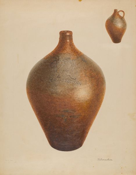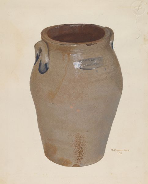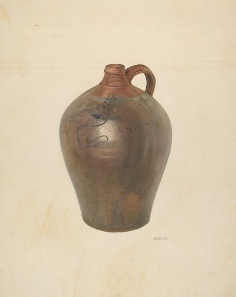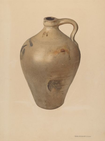 Curator: Well, hello there! This understated little marvel is Elsie Wein's "Jug," circa 1938. She's worked in watercolor to capture what looks like a humble earthenware jug. What catches your eye first? Editor: The cracks! And the subdued palette. It whispers of history, of functionality softened by time and perhaps a few clumsy hands. There is something about the symmetry in contrast with the fissures that intrigues. Curator: You picked up on the cracks! I love that you saw that. For me, they add such vulnerability to a simple, useful object. Makes you think, what stories it could tell, right? Maybe this drawing honors this specific jug’s life, not just jug-ness in general. The dark detailing above seems like a deliberate choice to lift a rather grounded piece into some form of regality. Editor: Precisely! Those cracks become almost like wrinkles on an old face – each tells a story. And the darker garland design adds to that regality... It’s fascinating how a commonplace object can be imbued with such…presence, almost. Blue is the colour for devotion. We see that decoration is only present on one portion of the pot so we are invited into the foreground narrative on one portion. What is behind it? Curator: Yes! Elsie seems to have plucked this vessel right from everyday life and put it on a little throne of paper. What ordinary thing in your life could you make magical simply by really, truly *seeing* it? She made realism exciting in some small way, don't you think? And she worked in watercolor which can be tricky... Editor: Absolutely, seeing the magic in the mundane, a concept with a rich and ancient history. The medium almost lends itself to the themes here. Watercolor mirrors the delicate, fragile nature of both the ceramic and perhaps life itself, reflecting transience and impermanence, with a permanence. The image persists when all is gone. Curator: Nicely said! That tension, capturing the object versus knowing one day it’s just memory… gives me the shivers. Editor: Makes you ponder what future archaeologists, human or otherwise, will make of *our* jugs and containers, doesn't it? Curator: Oh, cosmic thoughts, perfect way to leave this! Maybe Wein left us with a message about our simple things. We should treat them carefully while we have them.