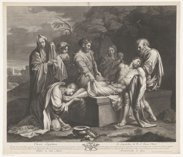 Curator: Look at the linear precision! The somber tones amplify the weight of the scene—absolute devastation. Editor: Indeed. This print, crafted by Francis Legat in 1792, depicts "King Lear Weeping Over the Body of Cordelia" from Shakespeare’s King Lear. It’s now held at the Metropolitan Museum of Art. Notice the fine hatching marks – it's drawing imitating engraving technique, quite telling, as Legat started out his career as an engraver, not an artist. The story, of course, is from Act 5, Scene 3 of King Lear. Curator: The composition pulls us right into Lear’s anguish, doesn't it? It’s interesting how the arrangement creates a stark contrast between the cold armor and drapery of the figures and the soft texture suggesting Cordelia’s lifeless form. Editor: And consider the economic implications of prints during this period! This image would have disseminated the tragic narrative of King Lear to a broader, perhaps less wealthy audience who couldn’t afford paintings. This accessibility is important—it democratized art consumption and ideas. And further note Legat was employed by Boydell Shakespeare Gallery, a printmaking business that aimed to benefit financially by publishing images inspired by Shakespeare. Curator: I’m struck by the details though. See how the sharp spear of the soldier punctuates the group dynamic – each element points us back to the tragedy in Lear's posture, which creates visual balance amidst turmoil. The material elements, how Legat created it... the ink itself is masterful. Editor: But beyond that, there is this commerce to consider and what these engravings did in promoting the art, as a manufactured commodity and cultural vehicle. Curator: You're right. Looking at the print through the lens of both the historical narrative and artistic execution, there’s a potent fusion of sorrow, artistry, and the human condition – all within a confined space. Editor: A perfect, compact drama made available by material means. It prompts reflection on tragedy, commercial viability, and accessibility, proving these aspects do indeed enrich our viewing experience.