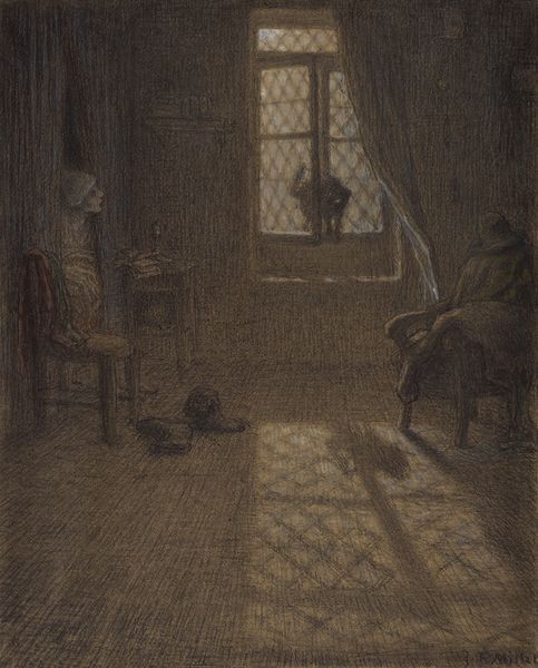 Curator: Jozef Israëls' work, dating between 1834 and 1911, is aptly named "Alleen op de wereld," which translates to "Alone in the World." It's currently housed here at the Rijksmuseum. Editor: Immediately, a sense of stark solitude strikes me. The palette is restrained—primarily charcoals and muted colors—creating an atmosphere of palpable melancholy. The composition is simple, but deeply moving. Curator: Indeed. Israëls was a master of Realism, frequently portraying the lives of the impoverished with a directness and honesty that was both admired and criticized in his time. He used genre paintings like this to bring to light what many would have preferred to ignore. This drawing, rendered with charcoal and ink on paper, typifies that approach. Editor: Looking closer, I’m struck by how the formal qualities amplify this feeling of loneliness. Notice the light falling harshly through the window, dividing the scene almost surgically. Then there's the way the artist renders the woman herself; head bowed, her form almost blending into the somber colors of the room, reinforcing a lack of agency and profound isolation. Curator: Absolutely. Israëls was associated with the Hague School, and he uses their favored subject of peasant life to expose harsh socio-economic conditions. Intimism plays a huge role as well. The viewer becomes a sort of intruder, passively witnessing an unguarded, intensely personal moment. Editor: I'd agree with that assessment. He is deliberately making use of the light source, positioned to the top left of the subject in question. That particular technique immediately conveys the tone of a narrative by its stark chiaroscuro effect—making a formal statement, almost as if highlighting one specific direction. What this might symbolize as a formal characteristic would speak more of its intimate details. Curator: I think your close read brings an insightful, relevant and acute level of meaning. That chiaroscuro also underlines the fact of a grim reality, where light struggles to penetrate the gloom, much like hope in a life filled with hardship. He presents her internal state through the very architecture of the drawing itself, a reflection of society's structures onto individual experience. Editor: Ultimately, looking at "Alone in the World," I can’t help but consider the artist’s intent – that such raw emotion on display must serve some didactic purpose. It remains powerfully resonant today as a case study of individual tragedy writ large across history and humanity. Curator: Yes, reflecting on the broader scope here at the museum, what lingers most is his empathy toward human vulnerability under socioeconomic pressure—a subtle, important note against an often too grandiose score.