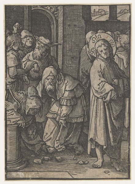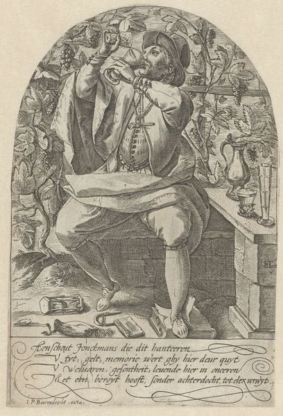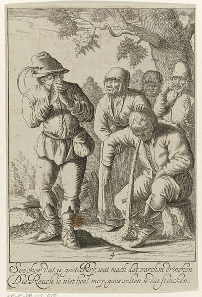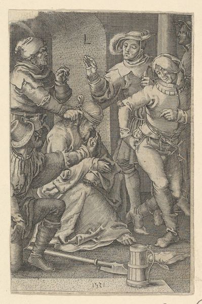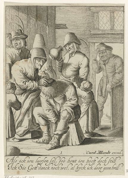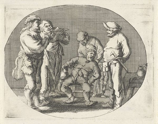 Curator: What we have here is a work entitled "Gezicht", created sometime between 1600 and 1670. It is currently held in the Rijksmuseum. While the creator remains anonymous, the pen work definitely leaves an impression! Editor: My word, that's a raucous bunch! Looks like a scene straight out of a slightly unsettling tavern. Everyone is crammed together; their faces are intense, verging on manic. There is an unsettling balance of comedy and discomfort... quite striking. Curator: Indeed. Consider the cultural context of the time. The 17th century Netherlands, a society undergoing rapid changes with new social structures and behaviours coming into view. Editor: That definitely rings true looking at how closely knit, perhaps suffocatingly so, everyone is assembled. I cannot help but ponder whether it shows how gossip, critique, and the scrutinizing of personal lives were becoming rife within social dynamics? The composition reinforces such interpretation as the gaze and focus of almost all the figures within it seems to be solely directed at what’s immediately at the composition’s heart. Curator: And note the clear narrative being built: there is the seated character; is he the epicenter? And is that another one looming with a pitcher held above? There are definitely themes of social control being displayed in a dramatic format here. Editor: Social control, but maybe also societal anxieties and the theatre of daily life, too. The dark lines definitely seem to accentuate a certain ominous quality of mundane events. The lack of sharp contrasts definitely hints that such kind of "spectacles" were extremely common occurrences, to be recorded and displayed. Curator: Absolutely, art from this era often served as a form of social commentary. Prints such as this are fascinating, serving not only to record but also critique prevailing mores. Editor: A critical reflection, cast with the weight of personal history and the ever-unfolding narrative of human experience. It surely does feel both familiar and bizarre!