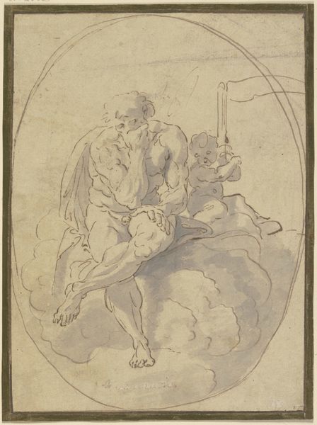 Johann Matthias Kager created this drawing, "Venus, Apoll und Amor, durch die Wolken schwebend," with pen and grey ink at an unknown date, and it now resides in the Städel Museum. At first glance, the eye is drawn to the figures suspended within a nebulous space. The composition emphasizes upward movement, reinforced by the reaching gestures and the implied lightness of the floating figures. Kager’s strategic use of line creates a sense of ethereal weightlessness. We see classical figures, rendered with anatomical awareness, yet they are presented without the solidity we might expect. This interplay between form and anti-form is thought-provoking, destabilizing the established Renaissance values of clarity and groundedness. Instead, the drawing leans into a more Baroque sensibility where drama and dynamism reign. This stylistic choice, combined with the subject matter, asks us to consider the function of mythology, how it reflects both continuity and change in artistic expression. Note the artist’s signature. In its placement and style, it underscores the human act of creation within the divine. It remains a site of ongoing interpretation, challenging us to reconsider the boundaries of art, divinity, and the artist’s role.