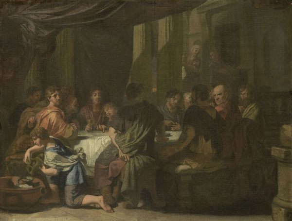 Curator: We're looking at Peter Paul Rubens' "The Last Supper" painted sometime between 1654 and 1655, rendered in oil paint. It's a compelling scene, wouldn’t you agree? Editor: My first impression is one of lavishness, but also discomfort. There's a density to the scene, a crowding…and what about this prominent water jug on the left, stealing space from the sacred figures? Curator: The drama, theatrics, and intense emotion displayed are quite typical of Baroque art from the time. Think of the Counter-Reformation influence, visually reinforcing the importance of the Eucharist. Editor: Sure, but beyond that, what was involved in the material process? Rubens’ workshop certainly played a role here. Oil paint allows for layering and richness, but how much was Rubens hands-on versus assistants prepping canvases and grinding pigments? What sources provided these expensive, rich pigments? Curator: It’s fascinating to consider how artistic production mirrors societal structures. Here, Rubens likely had workshop assistants fulfilling roles much like an early assembly line to complete this piece, playing to his public as the great master, and in turn solidifying his place as an essential figure in religious painting of the time. Editor: The red drapery dominates the top of the canvas. Who wove those textiles, dyed them? Were they purchased, bartered for, or gifts? Each color and piece represents value and the means of acquisition and representation for a culture eager for excess, especially religious iconography. Curator: Indeed, the symbolism is crucial. This is an idealized and carefully curated moment, aiming to elicit an emotional response from the viewer, drawing them into the heart of the narrative as much as possible. Editor: It does highlight how art becomes a product, a symbol of status as much as an expression of devotion. Looking beyond Jesus himself to see the making of such complex painting allows a window into a wider society and the economics that shaped cultural aesthetics and values. Curator: Seeing Rubens’ vision through that lens is definitely enlightening and something our visitors can consider. Editor: A painting is much more than brushstrokes on a canvas, really. Thanks for providing a wider frame on this magnificent, intense, Baroque painting.