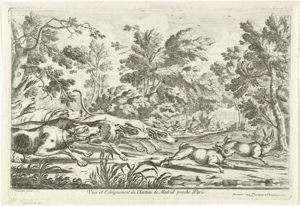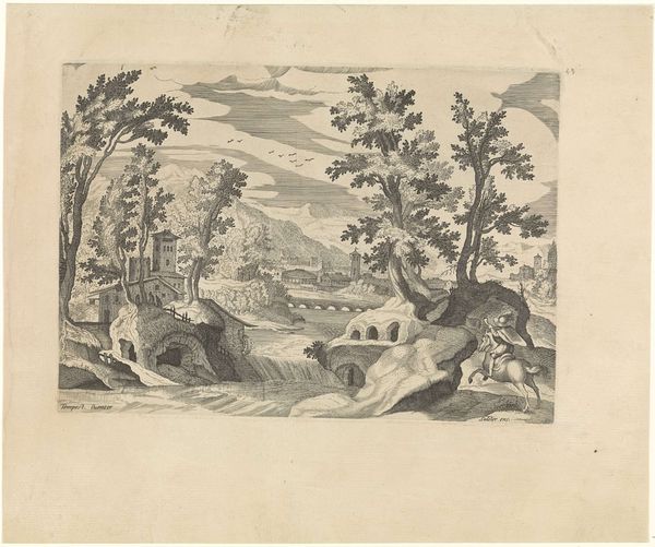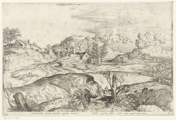 Nicolas Pierre Loir created this landscape with houses and a sleeping man in front, using etching. It presents a serene scene, dominated by horizontal lines and the calming effect of the monochromatic palette. Notice how the composition is structured into distinct horizontal layers—the foreground with the sleeping figure, the middle ground with the houses nestled among trees, and the background fading into the sky. The etching technique, with its fine, precise lines, creates a detailed yet tranquil atmosphere. The sleeping man in the foreground is strategically placed to draw us into the scene, inviting contemplation. The act of sleep itself can be seen through a semiotic lens, representing a temporary escape from the demands of labor and societal expectations. The landscape is not merely a backdrop but an active participant in conveying themes of rest, reflection, and perhaps a subtle critique of the human condition. The work invites us to consider how the formal elements of art—line, composition, and subject matter—converge to produce meaning, challenging us to reflect on our relationship with labor, leisure, and the natural world.