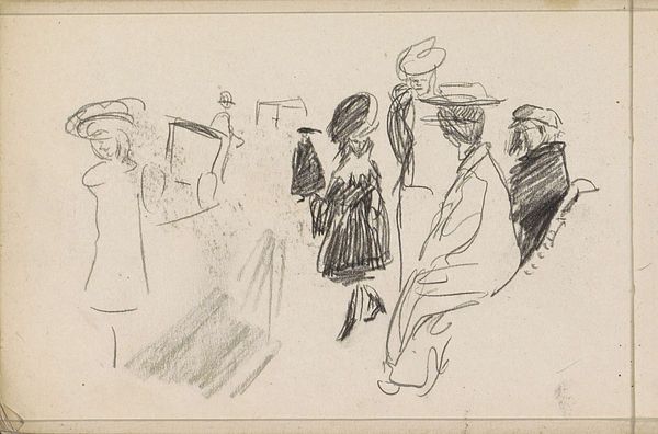 Editor: We're looking at Lucien Pissarro's "In the Gallery," a pencil drawing from 1889. I find it intriguing how Pissarro captured the feeling of being in a crowded gallery space with such simple means. What jumps out to you about this work? Curator: The orchestration of line is indeed remarkable. Note how the artist employs varying densities of hatching and cross-hatching to delineate forms and textures. Observe the contrast between the tightly rendered foreground figures and the more loosely defined paintings on the wall. This dichotomy creates a compelling sense of depth and space. What is your interpretation of the formal relationships? Editor: It seems to me the repetition of dark shapes—the hats, the coats—create a rhythm that mirrors the rows of pictures in the gallery. And the figures are all oriented toward the artworks. Curator: Precisely. The repetition generates a visual cadence. The convergence of gazes upon the framed works directs the viewer's attention as well. Do you perceive any disruption in this arrangement? Editor: Perhaps the figure on the left, whose face is mostly obscured, drawing my eye in and out of the depicted space. It sets up some tension, preventing it from becoming just a mere record of an art-viewing event. Curator: Yes, this is quite apt. It’s not merely mimetic, but constructs a particular visual experience. This piece invites us to examine not just *what* is represented, but *how* it is represented. The drawing compels viewers to confront the mechanics of perception itself. Editor: Thank you! I see now how a deep dive into its form gives more insight than initially looking for just what it depicts.