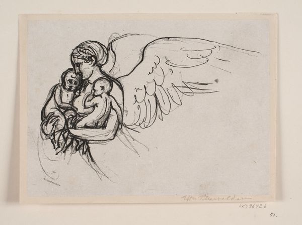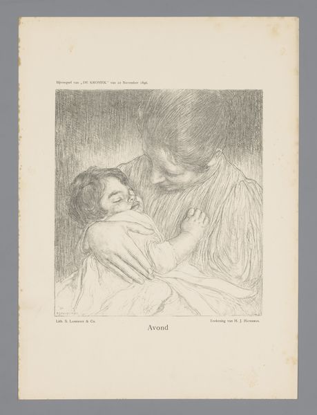 Curator: Oh, it's tenderness embodied. The texture alone feels soothing. Editor: That’s a wonderful way to put it. This is "Avond," or "Evening," by Hendrik Johannes Haverman, created in 1896. It’s a pencil drawing, now residing here at the Rijksmuseum. The work is also noted for its influence by Intimism, a movement reflecting domesticity and quiet moments. What do you feel draws you into the scene so immediately? Curator: Absolutely the embrace. It radiates warmth. See how the mother's gaze is so focused, protective. The soft gradations in the pencil work evoke a palpable sense of comfort. Editor: Yes, it captures the quiet, hallowed domestic space that was gaining attention amongst the middle class. This intimate portrayal moves away from public, historical themes dominant in earlier art academies and caters to intimate and sensitive subjects. The lines around the hair and dress are sharp yet not constricting, but it gives definition without losing the serenity. Haverman was, in some ways, contributing to the emerging cultural value placed on private life and familial bonds. Curator: Exactly. It whispers secrets about the power of intimate, ordinary moments, of simply being. There is a quiet rebellion in it that still moves me. The symbolism is not overt, it's almost…inherent, built into the gestures. The protective hug seems a primal act of the evening— guarding someone so young into dreamland. Editor: Precisely, and how daring to elevate it in the artistic cannon! To turn from battles to bedtimes. It really marks a turn, even at the cusp of the twentieth century. It asks the question "Is this quiet affection not art worthy"? Curator: To capture something so inherently quiet with such precision and nuance. Art exists within a culture to elevate certain perspectives to center stage. Perhaps this moment could be staged—the models—but that feeling you get when the work reveals the inner soul and tenderness within a scene? A true gem of an era defining beauty as more than pageantry. Editor: Indeed. Haverman invites us to consider beauty, love, and affection not as symbols, but inherent within lived experiences and spaces. It has really been a moment to examine these complex layers with you. Curator: Likewise, thank you! This tender image will follow me tonight and probably beyond.