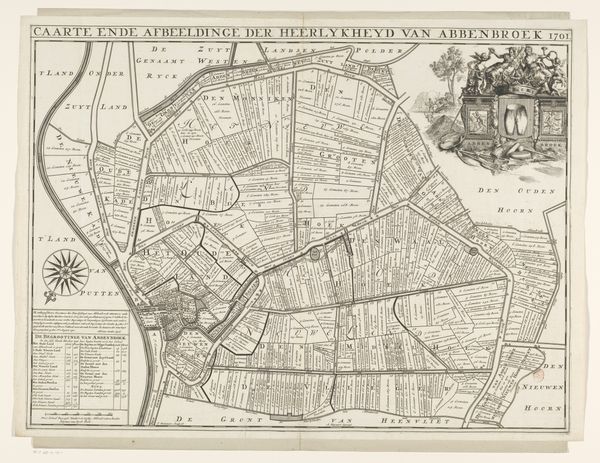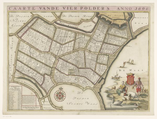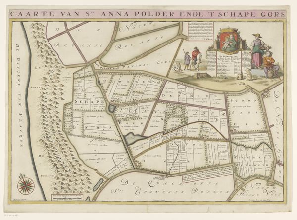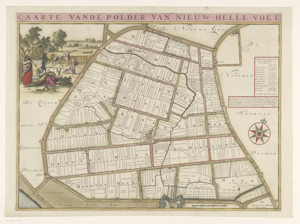 Curator: Here we have “Kaart van de Sint-Cornelispolder (Quackpolder),” created between 1701 and 1729. It's a drawing rendered in pen on paper by Jan Stemmers. Editor: My first impression? Order! An idealized vision. The landscape here, though presented as a functional map, feels almost meticulously composed, almost sterile. Curator: Maps like this weren't just about navigation; they were assertions of control. Consider the social implications of land ownership reflected in this genre painting: Who held power, who labored, and who was excluded from the narrative being created here? Editor: Absolutely, but let's focus on the “how.” Look at the density of pen strokes; that's laborious! The material process reflects the intense management of the land itself. Canals, plots, even the script—all point to imposed order, human labor wrestling with nature. Curator: Indeed. Notice how the perspective flattens, turning land into property to be surveyed and distributed. Who benefits from such “rationalization” of space? Land ownership and power dynamics during this era determined access to resources. And what were the potential impacts for displaced communities or exploited workers? Editor: The very act of drawing this map changed the polder. Creating divisions and enabling administration reshaped the landscape. Pen, ink, and paper weren’t passive recording devices, but active tools in reshaping territory. The small figures in the upper right serve as stakeholders literally watching over all the agricultural resources! Curator: And in the way land becomes quantified, measured, and claimed, we can discern power structures at play. Who gets to define and claim ownership? Editor: It's easy to overlook the artifice in a seemingly utilitarian object, but Jan Stemmers offers insight into the means and motivations behind that process. Curator: So next time, perhaps ask not just, "what does this represent," but "who decided that? And who was erased?" Editor: Maps speak, but what about what is suppressed during their construction? Worth considering indeed.