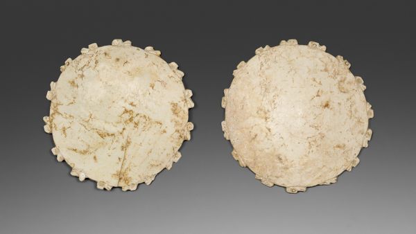 Curator: Here we have a photograph, titled "4 knopen horend bij een jas," or "4 buttons belonging to a jacket" from around 1740 to 1760. It's presented as a piece of product photography, isolating the objects on a neutral background. Editor: My initial impression is one of understated elegance; they appear so worn, yet still so refined, positioned thoughtfully within the frame. I am intrigued by the visual economy at work here. Curator: Precisely. Consider the social context of these buttons. They represent not just function but status, crafted within specific workshops or by individual artisans of the time. What processes were in place to create this sense of luxury in clothing in the 18th century? These would have fastened a coat worn by someone of considerable means. Editor: Visually, I'm drawn to the subtle variations in shape and surface texture. Even isolated as they are here, each button possesses a unique character. The muted, earthy tones evoke a sense of timelessness. Notice the simple composition— the photographer's deliberate choice to emphasize form and materiality over, say, symbolic value. Curator: Indeed. The material itself, what might it be—bone, horn, or a precious metal like silver? These would have had different cultural associations, each telling a specific story. Consider how mass production would alter not just the appearance, but the intrinsic value of such an object over time. Editor: Absolutely. In terms of visual weight, the artist also creates a dialogue between light and shadow that articulates the curves. Although this feels contemporary due to its photographic medium, the timeless subject matter creates an interesting tension. Curator: We also see these as representations of consumerism then compared to our time. Did the owner repair them or were new, possibly of lesser quality, materials purchased? Editor: Seeing these now creates an interesting perspective on our relationship to craftsmanship in an ever disposable society. Curator: Exactly! The journey of these buttons is full of many meanings when analyzed through a materialistic point of view. Editor: A fitting commentary on time, value, and how something as commonplace as buttons becomes imbued with quiet beauty when viewed from the right angle.