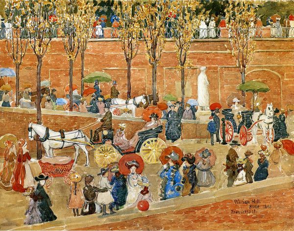 Maurice Prendergast created this watercolor painting, “Central Park”, which is now located at the Whitney Museum of American Art. The composition unfolds in horizontal layers: a fence in the foreground acts as a barrier, beyond which figures populate the scene in a frieze-like arrangement. Patches of color suggest both depth and surface, with dabs of paint coalescing into carriages, trees, and people. Notice how Prendergast employs a restricted palette, favoring muted greens, browns, and blues, with the occasional splash of red or orange to draw the eye. The loose brushwork and flattened perspective distances itself from academic realism. Instead, the artist is interested in the interplay of forms and colors on the picture plane. The structural elements—the fence, the rows of figures, the rhythmic repetition of shapes—create a sense of order, yet the spontaneity of the brushstrokes injects vitality into the scene. Consider how Prendergast uses watercolor, embracing its fluidity to evoke the dynamism of modern life. The painting serves as a visual record and prompts an investigation into the formal possibilities of the medium.