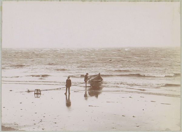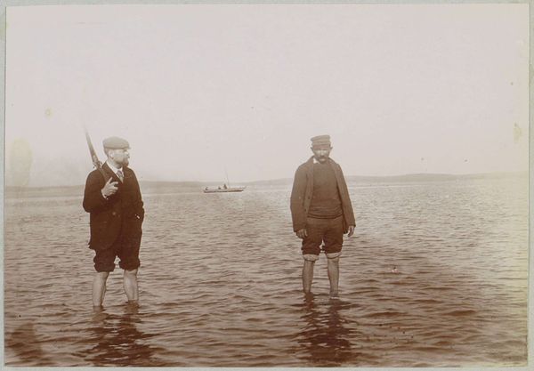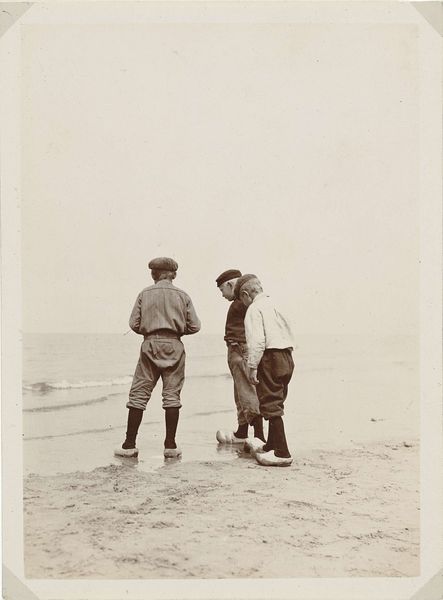 This small, anonymous photograph presents a figure bent over on a beach, their head obscured. The figure adopts a posture that evokes the movements of a crab, bridging the human and animal worlds. The image resonates with the historical context of early photography, where the act of capturing a moment was a deliberate and somewhat awkward undertaking. Early photography often involved cumbersome equipment and long exposure times, imbuing it with a sense of performance. The image plays with the idea of identity, or perhaps the loss of it. The figure, dressed in formal attire, seems strangely out of place amidst the natural, fluid environment of the beach. This tension invites contemplation on the relationship between humanity and nature, and the roles we perform within those spaces. What do you feel when you view this image? Does it make you question your own performance of identity?