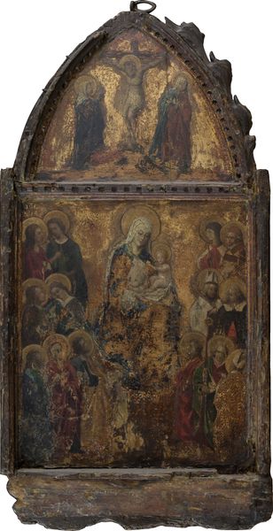 Lo Scheggia, born in 1406, painted this Triumph of Eternity. It is an egg tempera on wood, with a vibrant yet subtly organized composition. The upper register hosts heavenly figures, painted with a linear and somewhat flattened perspective. The lower section shows an earthy realm with an apocalyptic scene. The composition employs distinct registers to separate the divine from the terrestrial, reinforcing a hierarchical structure. The bright hues and gold leaf in the upper part contrast sharply with the earth-toned lower area. This contrast isn't just aesthetic; it's semiotic. Gold signifies the divine, while the darker colors invoke mortality. The figures, rendered with simple yet expressive lines, inhabit a space that predates the complexities of Renaissance perspective. The flattening of space and the stylization of forms reflect a medieval sensibility, yet the detailed faces suggest an emerging interest in naturalism. This combination of styles complicates any straightforward reading of the piece, challenging fixed notions of artistic progression. The work, thus, is not merely a religious depiction but an exploration of form and meaning.