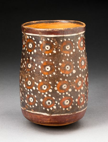 Nonomura Ninsei created this vase, or hanaire, during the Edo period in Japan. Born in a transformative era, Ninsei navigated a society marked by both rigid social hierarchies and flourishing artistic innovation. As pottery gained prominence beyond mere utility, artists like Ninsei were instrumental in elevating its status. During this period, the tea ceremony was evolving, becoming entwined with Zen Buddhism and emphasizing harmony, respect, purity, and tranquility. The dark glaze and simple form can be viewed as a move away from opulent styles, aligning with the tea ceremony’s increasing focus on simplicity and wabi-sabi, or the beauty of imperfection. With its textured surface, this hanaire invites contemplation. It reflects a societal shift towards valuing the handmade and the imperfect, where the artist’s hand is celebrated.