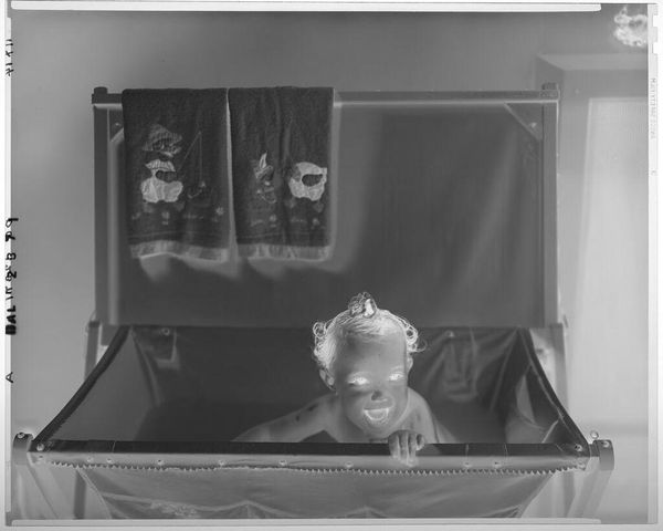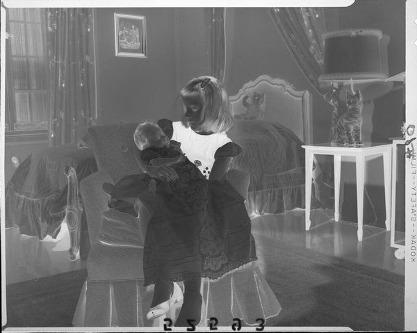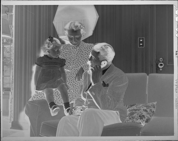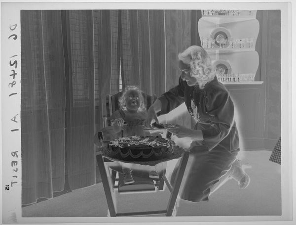 Paul Gittings created this black and white photograph of a mother and child, sometime in the mid-twentieth century. The scene depicts a mother kneeling beside her daughter, who is sitting in a high chair, ready to cut her first birthday cake. This image speaks to the cultural emphasis on family and domesticity prevalent in the post-war era, especially in America. It captures a seemingly intimate moment, yet its staged quality suggests a deliberate construction of idealised family life. The photograph’s formal composition, with the mother and child carefully arranged, raises questions about the performative nature of such domestic scenes. Was it commissioned for a family album or perhaps even for publicity? To understand its full context, one might research the history of family photography, consumer culture, and gender roles during this period. By exploring such avenues, we can appreciate how the photograph reflects and shapes our understanding of social values.