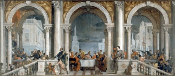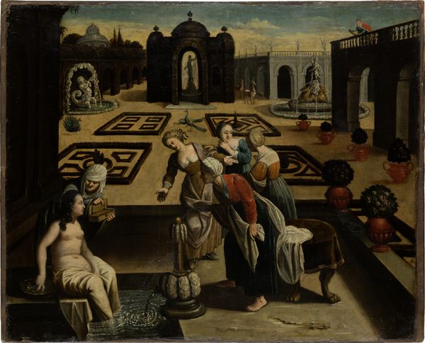 Dirck van Delen’s "A Seven-Part Decorative Sequence: A Gallery," is an oil painting showcasing both his mastery of perspective and the cultural values of his time. The meticulous detail in rendering the architecture is striking. Note the marble columns, checkerboard floors, and classical sculptures – all achieved with careful brushwork and an understanding of light and shadow. While these materials aren't physically present, Van Delen convinces us of their weight and texture through skillful illusion. The presence of wealthy figures strolling through this gallery suggests a society that values art and leisure. The architecture itself speaks to power and status, reflecting the patron’s desire to display wealth and sophistication. The labor involved in creating such an elaborate space is hidden, yet it’s essential to the scene's overall impression. Van Delen's work blurs the line between fine art and craft. He invites us to consider how both contribute to the construction of cultural meaning.