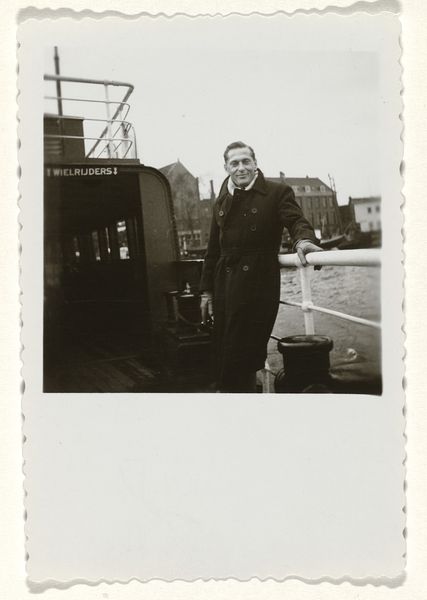 This photograph, of unknown date and authorship, captures Gideon Elon, Isabel Wachenheimer’s third husband, beside a tour boat. Its aesthetic hinges on the stark contrast of light and shadow, typical of black and white photography. The composition divides the scene into distinct planes, emphasizing the figure against the backdrop of the boat and urban architecture. Elon's positioning, with his foot casually placed on the railing, introduces a dynamic asymmetry, challenging the static nature of portraiture. The architecture looms behind the boat, creating a sense of depth and enclosure. This interplay between figure and environment, flatness and depth, echoes the semiotic tension between surface and underlying structure. The photograph becomes a sign, gesturing towards broader themes of identity, and the interplay between personal narrative and the built environment. Note how the monochromatic palette strips away color, encouraging us to focus on form and texture. This photo is not merely a snapshot but an invitation to decode the complex interplay of visual elements.