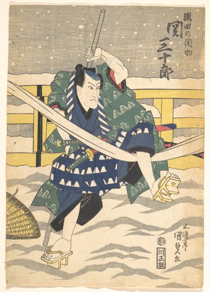 Editor: Here we have "Actor as Archer," a woodblock print created by Utagawa Kunisada in 1847, now at the Rijksmuseum. I'm struck by the detail in the clothing, but I'm also curious about the context of portraying an actor rather than a warrior. What are your thoughts on this print? Curator: The depiction of the actor and his elaborate costume interests me here. Consider the paper and wood used in the production process of this ukiyo-e print. Each impression, crafted from carved woodblocks, made art accessible. These were not precious paintings but commercial objects circulated within a specific market. How does the material's mass production and consumption shift our understanding of "art" and its social role at the time? Editor: That’s a fascinating perspective! So, the value isn’t necessarily in the singular image, but in the process of its making and distribution? I never thought about that aspect. What would the effect have been of producing multiples on consumer culture? Curator: Exactly! And notice the labour embedded in this seemingly simple print. Think about the artisans needed for each step, from design and wood carving to printing, to create items such as this that reflected societal desires. Would you say that it challenges the notion of individual artistic genius? Editor: It really does. It emphasizes a collaborative effort tied to consumerism. Instead of a lone genius, we see a system of labour catering to the demands of entertainment and popular trends. It opens my mind to reconsidering how artistic value is attributed. Thank you for opening my eyes! Curator: And thank you! Examining the material conditions behind art offers fresh ways to interpret and appreciate art.