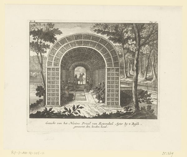 This engraving depicts a gathering in the pergola of Rosendael Castle by an anonymous artist. The scene offers us a glimpse into the social rituals of the Dutch elite. The image presents a carefully constructed space, both artificial and natural. The pergola itself, with its geometric structure, contrasts with the surrounding trees. Inside, figures are arranged in a semi-circle, suggesting a performance. We are witnessing a staged event that speaks to the importance of leisure and display among the wealthy. This image, therefore, reflects the values of a society that prized both cultivated nature and social spectacle. Understanding this print means delving into the history of Dutch landscape design and social customs. Research into estate culture could reveal the meanings embedded in such gatherings. By looking into the archives, we might uncover the individuals who frequented Rosendael, adding depth to our understanding of this captivating scene.