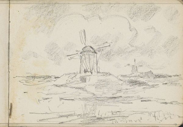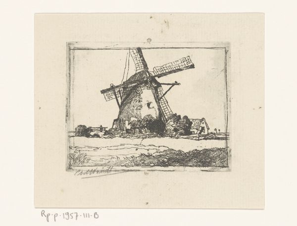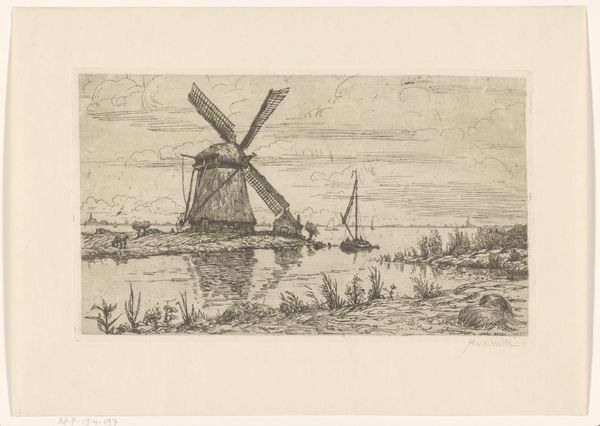 Johannes Tavenraat’s "Waterlandschap met molen," currently held at the Rijksmuseum, is a drawing executed with delicate lines in pen. The composition centers around a serene waterscape, where a windmill and figures in boats create a harmonious balance. The light grey wash evokes a sense of tranquility, inviting quiet contemplation. Tavenraat masterfully employs line and form to construct depth and texture. Note how the vertical strokes used to depict the reeds contrast with the horizontal lines delineating the water's surface, creating a sense of spatial recession. The windmill, rendered with precise detail, anchors the composition, while the figures in the boats add a human element to the scene. This artwork challenges conventional landscape portrayals through its structural simplicity, offering a contemplative view. The absence of vibrant colors directs our attention to the tonal variations of the wash, inviting us to ponder the relationship between form and perception. This quiet scene captures the essence of Dutch landscape art while prompting us to reflect on our place within the natural world.