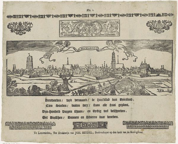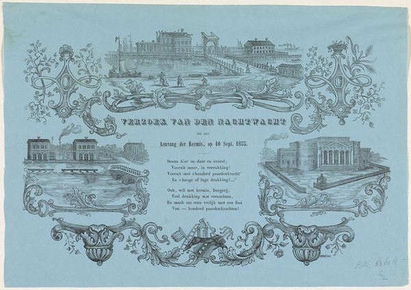 Editor: This engraving, titled "Afbranden van de Stoom-Suiker-Raffinaderij Lauriergracht Amsterdam, 1880" depicts the burning of a sugar refinery. It feels a bit strange – the detailed, almost celebratory border clashes with the destruction shown within the image. How do you interpret this work? Curator: The contrast is key, isn't it? This image isn't just about a fire; it’s about the social and economic context surrounding that event. Consider the frame, so meticulously rendered. What does its presence tell us about the intention of the print? Editor: Maybe that it was intended to commemorate the event? Curator: Precisely. But commemorate for whom? The inscription notes the print was produced “for the benefit of the 400 workers.” Look at the firemen in the center; the refinery aflame to the left and right of them. How does that imagery connect to 19th-century labor practices and class divisions? Editor: It seems to highlight the vulnerability of the working class. A single fire could devastate their livelihoods. Was there a strong labor movement in Amsterdam at this time? Curator: Absolutely. This print speaks directly to anxieties around industrial capitalism. It’s a disaster, yes, but also an opportunity to highlight the precarity faced by those who fueled the economic engine. Editor: So the framing isn't celebratory, but maybe more of a… fundraising appeal? Curator: Exactly. The aestheticization of disaster is used to tug at the heartstrings – and purse strings – of potential benefactors. The very act of memorializing becomes a form of activism. It underscores the power dynamics at play in the relationship between capital and labor. Editor: I never thought of it that way. I was focused on the depiction of the fire, but the purpose behind the print is just as important, maybe more so. Curator: It's a reminder that art always operates within a specific socio-political landscape, prompting a discourse.