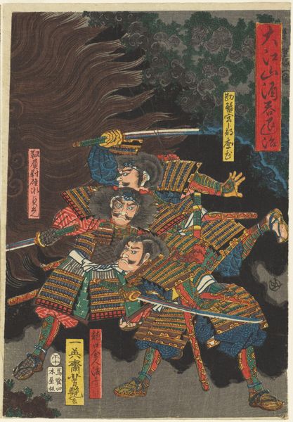 Editor: This triptych by Utagawa Yoshitsuya, titled Shuten dÅji at Åeyama, depicts a very dramatic scene. The colors are intense, and the central demon face is quite imposing. What can you tell me about this work? Curator: Well, isn't it a marvel? Yoshitsuya really knew how to ramp up the drama. Beyond the visual spectacle, consider this—it's a clash of worlds, isn't it? Order versus chaos, man versus monster. It evokes a stage play, almost like the artist wants us to wonder, 'Who are the real monsters here?' Editor: That's a really interesting perspective. I was so focused on the surface level of the image, but now I see the deeper conflict. Curator: Exactly! It reminds us that art often asks questions, it rarely provides easy answers. Keeps us on our toes, doesn’t it? Editor: Definitely something to think about. Thanks for opening my eyes to that. Curator: My pleasure! It's these little sparks of insight that make art so endlessly fascinating.