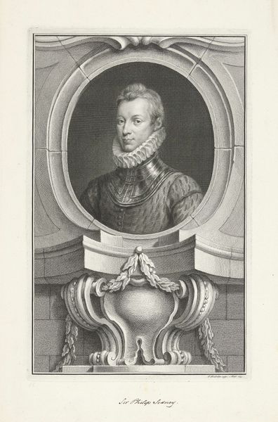 Editor: This is "Portret van Jacob van Heemskerck," an engraving by Jacob Houbraken, created sometime between 1751 and 1753. It feels very formal and stiff, like a historical document frozen in time. What do you see in this piece beyond its surface representation? Curator: More than a mere depiction, this engraving operates as a powerful form of cultural inscription. The choice to represent Jacob van Heemskerck in full military regalia is telling. This image promotes and reinforces the ideals of a militaristic society. Consider, too, the artist's own position within this historical and political structure: how might his identity and experiences have influenced the visual language of this portrait? Editor: So you're suggesting the artist's intention might be less about accurately portraying an individual and more about reinforcing a specific kind of societal power dynamic? Curator: Precisely. These portraits legitimized certain figures and validated particular power structures. Furthermore, engravings like this were widely distributed. To understand how the image participated in constructing identity for viewers across social strata, how did the engraving influence perceptions of leadership and national identity among the broader populace? Editor: That makes me see it in a completely different light. I initially thought of it as just an old portrait, but you’ve highlighted the political function it served, distributing and cementing specific societal values. Curator: Absolutely, it is a perfect window into the historical construction and circulation of power and identity, inviting us to critique how similar mechanisms continue to shape our understanding of ourselves and our societies today. Editor: Thanks so much for broadening my understanding; now I see this artwork as not only depicting history but as actively shaping it.