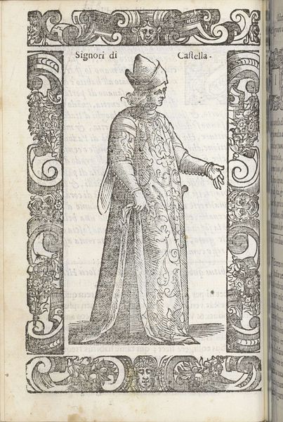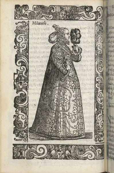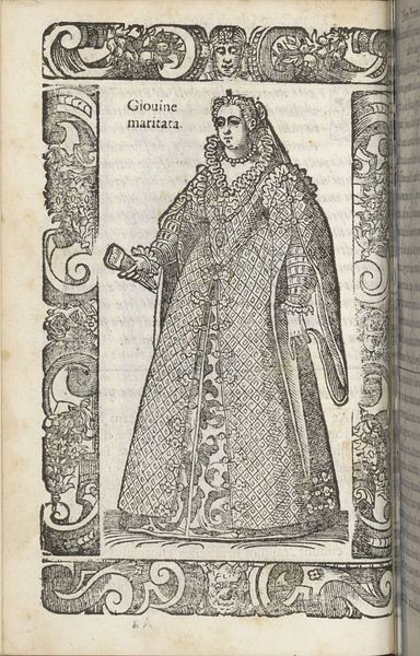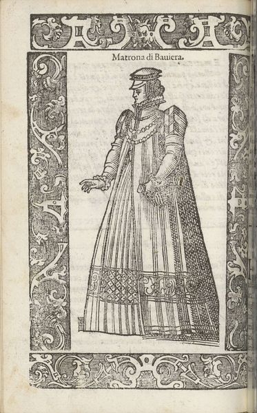 Curator: Today we're looking at a print entitled "Donna di Romagna" by Christoph Krieger, dating back to 1598. It depicts a woman, presumably from the Romagna region, in elaborate dress. Editor: What strikes me immediately is the intense detail in the clothing, juxtaposed with the flatness of the figure. It's a dizzying display of pattern and texture created simply with lines etched in ink. How was such an effect achieved so uniformly across this textile representation? Curator: These kinds of prints, especially during the late Renaissance, served multiple purposes. Certainly, they were artistic products, but they also acted as documents of social status. Clothing denoted one’s place within the hierarchy. What’s truly telling is that dissemination was made easier, meaning the latest fashions and representations of power could be propagated further than ever before. Editor: It's all about the labour involved, isn't it? Consider the production of the actual fabric the woman might have worn. It most likely came from an Italian textile workshop, designed, woven, and embroidered by many artisans, then emulated here through a different mode of skilled reproduction, an engraver replicating a representation through this very print. And ink! Its trade, origins... such an unassuming substance but it's what allows this image to be made and re-made. Curator: Absolutely. And this print likely circulated among the elite, reinforcing the ideals and aspirations of the time. It visualises power. The attire broadcasts prestige, becoming a model, even a tool. The history of fashion in art always brings fascinating class-related context to the fore, especially when that fashion is shown to be the signifier of success itself. Editor: You're right. This wasn't just 'craft'; it played a vital socio-political role. Every line tells of skilled craftsmanship and artistic application but what of the materials, where do they come from, what do they become through production in the workshops of the late 16th Century, what traces do they leave? Curator: In that respect, looking beyond pure aesthetics, it tells us about so much beyond the woman it claims to represent. Editor: Yes, precisely, beyond face value: material considerations, material transformation and an expression of labour.