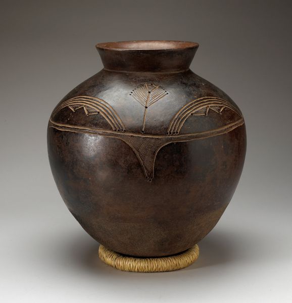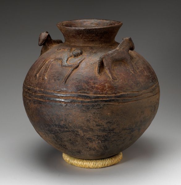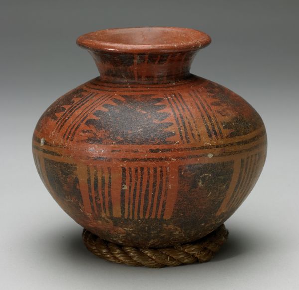 This single-handled pedestal jar was created by the Lambayeque people. The ceramic form is marked by geometric motifs and figurative appliques. At first glance, the jar presents a symmetrical composition that emphasizes balance and formal harmony. The terracotta surface is divided by horizontal bands featuring spirals and hatched squares, contrasting with the simplicity of dark circular motifs. The careful design of the jar suggests a sophisticated understanding of visual language. The bands encircling the vessel create a sense of order, yet the varying patterns within them introduce an element of visual complexity, destabilizing the strict geometry. The three-dimensional zoomorphic appliques interrupt the two-dimensional surface decoration, animating the form. The vessel challenges fixed meanings through its interplay of geometric abstraction and figural representation. This piece doesn't merely function as a container; it acts as a dynamic interplay between form and function. Its lasting impact resides in its ability to evoke a deep engagement with the material world and symbolic thought.