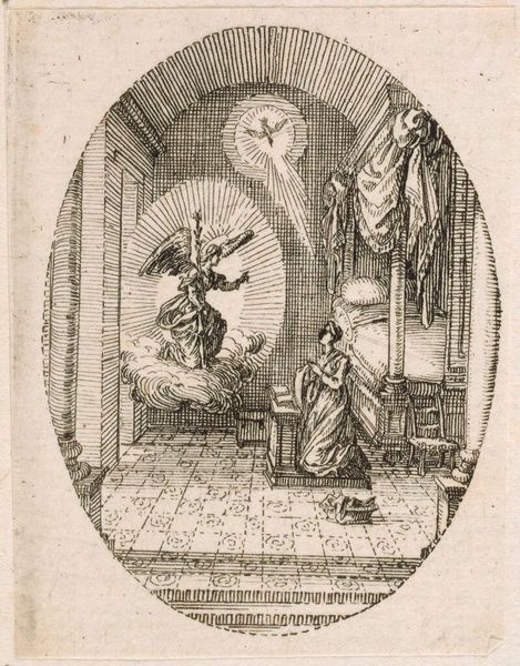 Editor: This is Jacques Callot's "Saints Tiburtius and Valerianus," a tiny print, barely three inches tall. It seems to capture a moment of divine intervention, but the details are so intricate! What draws your eye when you look at this work? Curator: Well, its miniature size belies the grand drama Callot manages to convey. Notice how the angel descends, bearing a crown – a symbol of martyrdom. It’s as if a whole story is unfolding in a single, carefully etched frame. Are you sensing a story here? Editor: Yes! The angel contrasts with the figures on the left. They seem to be doing something, maybe torturing someone? Curator: Indeed! Torture and divinity. Callot’s technical virtuosity allowed him to suggest so much with so little. The power of faith, the cruelty of man, all within this delicate oval. What a profound reminder that even the smallest things can hold immense meaning.